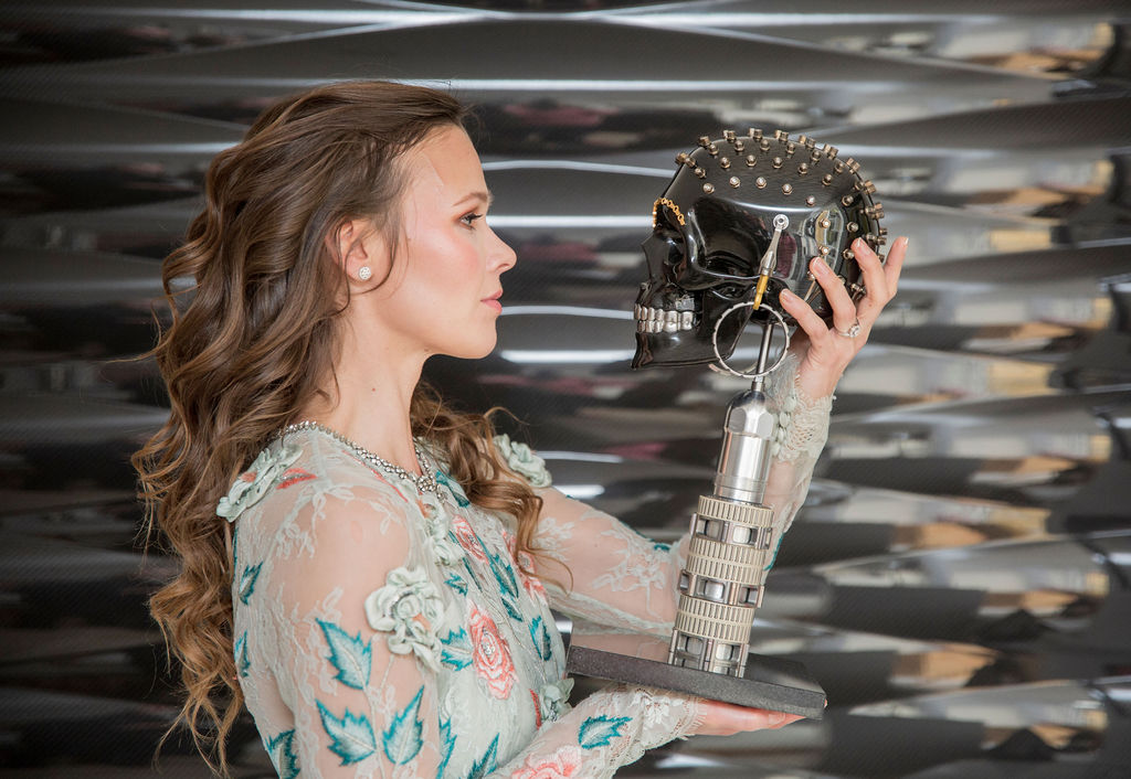 God Save The African Queen is a human skull sculpture made entirely of solid carbon fibre, enhanced with interactive features. Its striking beauty captivates viewers even before delving into its conceptual origins or intricate design. Gibson’s expertise lies in creating artworks that are aesthetically pleasing, rooted in meaning, and meticulously crafted.